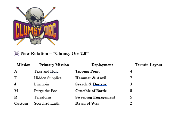 by AdminThe Clumsy Orc Stockport League is a relaxed 3-month Warhammer 40,000 RTT running January to March at Element Games. Players complete one 2,000-point game per month using missions from the 2025 deck, with rankings feeding into the wider Clumsy Orc 2025 season — including Tuesday Champions full-day RTTs. All games use Clumsy Orc terrain with official GW layouts, and results contribute toward the new annual Clumsy Orc Ranking, where the overall winner will take home a full-size Chainsword. - Fresh!