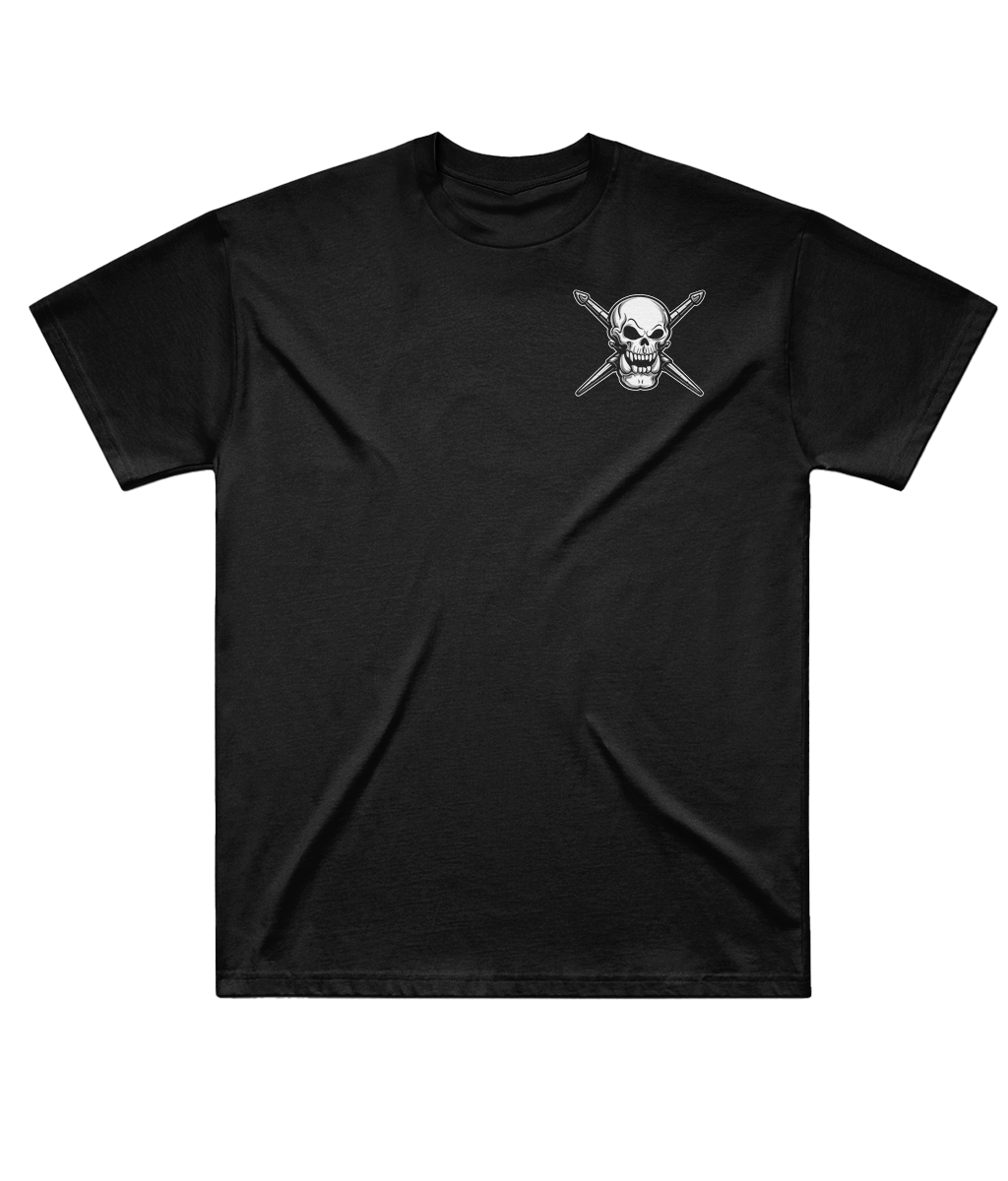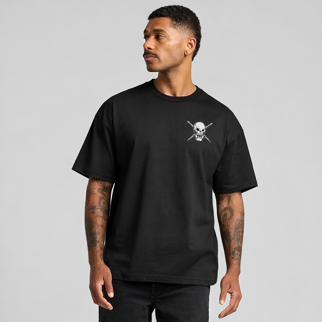 • Front: Minimal skull & crossed brushes icon (left chest)