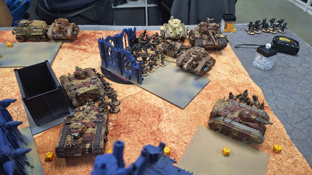 - Matt’s grizzled Astra Militarum fighting for survival against Ugo’s Bastion Taskforce — veteran soldiers versus elite defenders.