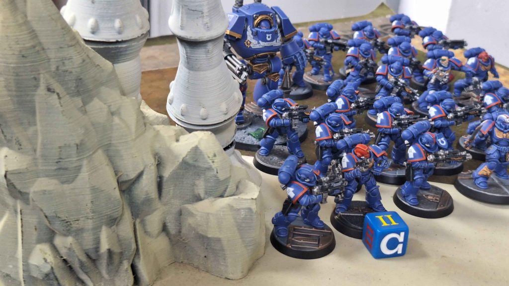 - Stephen’s Ultramarines attempting to storm Tom’s Aeldari stronghold in a tense narrative showdown.